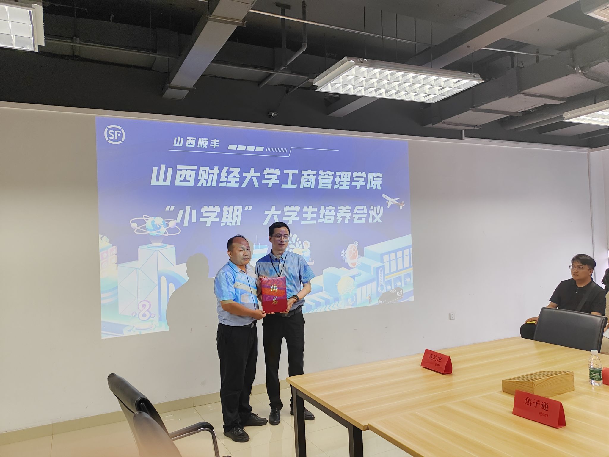 在提问与交流环节,山西顺丰参会者对学生们提出的问题进行了详细解答。刘江鹏主任代表学院向山西区人力资源部负责人靳宏斌经理颁发了本科生校外实践导师聘书。