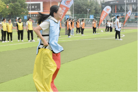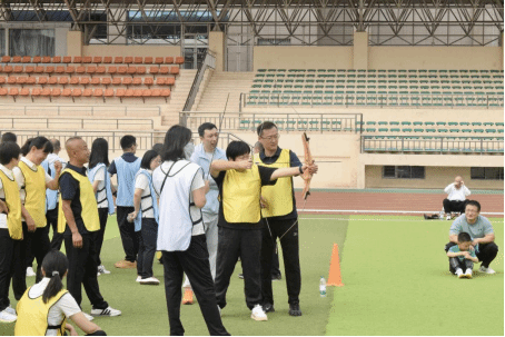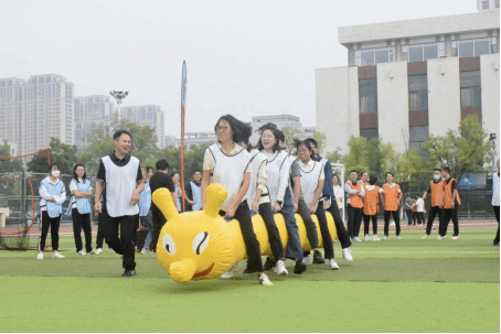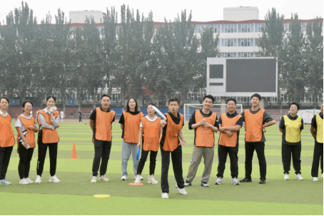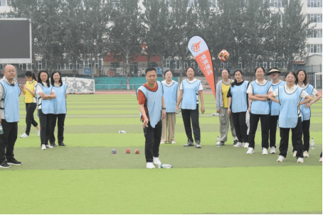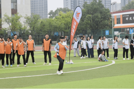 随后,趣味运动会正式开始。马威威老师将参赛队员随机分为蓝、橙、黄、白四队并带领大家进行赛前热身运动环节。本次运动会共设置了六项富有趣味性和挑战性的项目,分别是毛毛虫、蒙眼取水、飞盘掷准投网、真人射箭、沙包投掷盘和接力袋鼠跳。教师们积极参与,现场气氛热烈而欢乐。在毛毛虫项目中,教师们化身“毛毛虫”,通过团队协作,共同前进;在蒙眼取水项目中,他们需要克服视觉障碍,凭借感觉和团队协作完成任务;飞盘掷准投网则考验了教师们的投掷技巧;真人射箭项目中,运动员们展现了极高的心理素质和专注力;沙包投掷盘则要求教师们准确投掷,争夺高分;最后的接力袋鼠跳项目更是将团队合作和趣味性发挥到了极致。