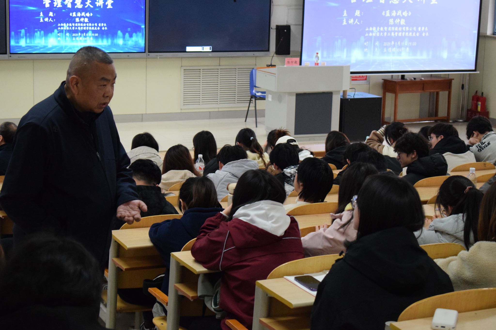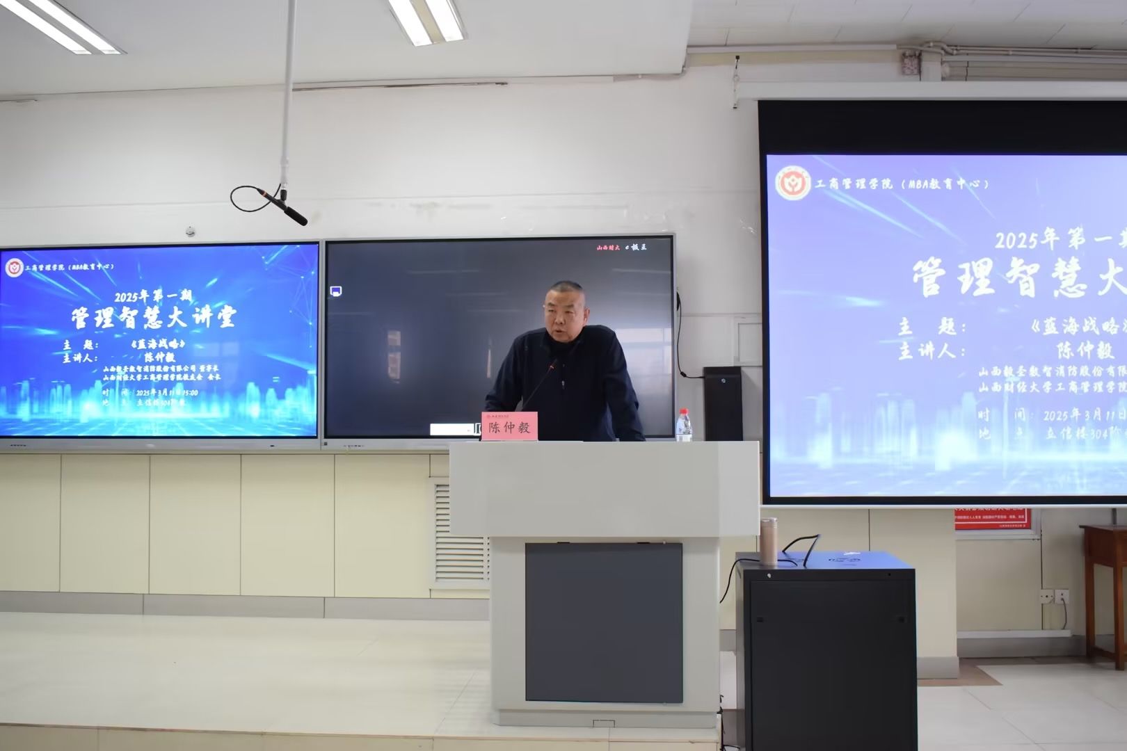 MBA教指委校外专家、山西毅圣数智消防股份有限公司董事长、太原市万柏林区人大代表、我校等多所大学客座教授陈仲毅先生,以《蓝海战略》为题,为同学们带来了一场精彩报告。学院2023级全体同学参加本次讲座。讲座由学院党委副书记周志刚主持。
