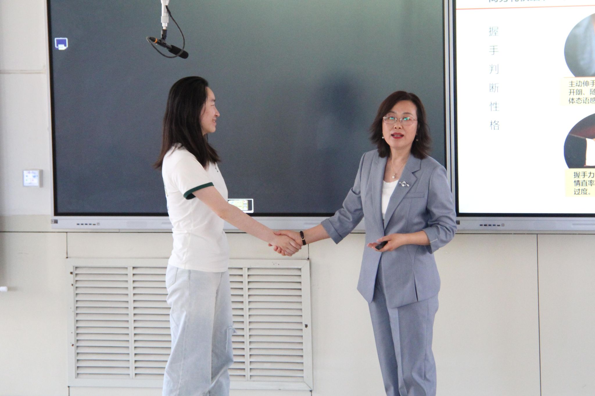 常秀荣以“所谓礼仪,扬情貌而明德之路”这一古语破题,从对礼仪的认知层面、理解层面及实践层面强调商务礼仪是职场人的关键软实力。讲座中,她结合自身丰富的职场经验,从基本礼仪、商务着装等多个维度展开分享。通过生动案例和实际场景模拟互动,深入浅出地讲解了在商务场合中适用的礼仪规范,让抽象的礼仪规范转化为可感知的肢体记忆。同学们纷纷表示,这种沉浸式学习让商务礼仪从书本知识变为可操作的职场软实力,进一步内化为个人的品德修养。