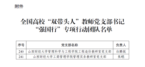 高校“双带头人”教师党支部书记“强国行”专项行动团队是经高校党委审核把关、省级党委教育工作部门择优推荐、专项行动办公室备案审核,遴选产生的。管理实务教研室党支部在本次专项行动周期,将由“双带头人”书记带头,支部全员参与,充分发挥高校“双带头人”的示范作用,在中国式现代化全面推进强国建设、民族复兴伟业新征程上砥砺新担当、展现新作为,以提供教育服务、推动科技赋能和深化实践育人为重点,旨在通过三年的持续努力,形成一套能够发挥高校“双带头人”作用,服务国家重大战略和地方经济、社会发展的机制,为地方经济社会发展提供有力的人才保障和智力支持。(韩晓文 供稿)
