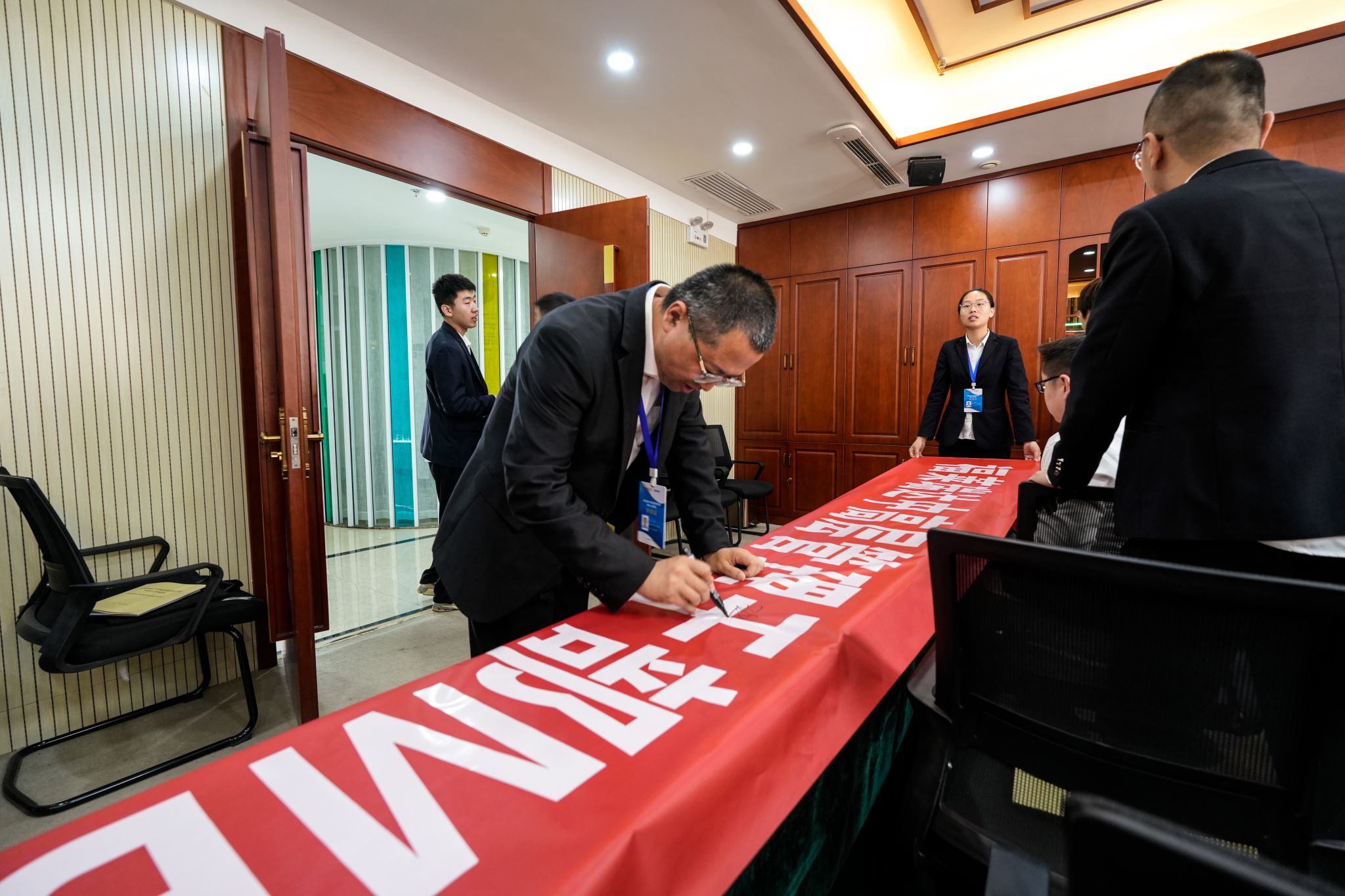 管理原理教研室主任张莉艳对研修班的总体设计和培养要求作了全面介绍;学员代表、公司副总经理杨珊代表全体学员作表态发言,表示将全身心投入到这次学习中,将所学转化为推动企业创新发展的动能;最后,双方领导,研修班学员在横幅署名,并进行合影留念。