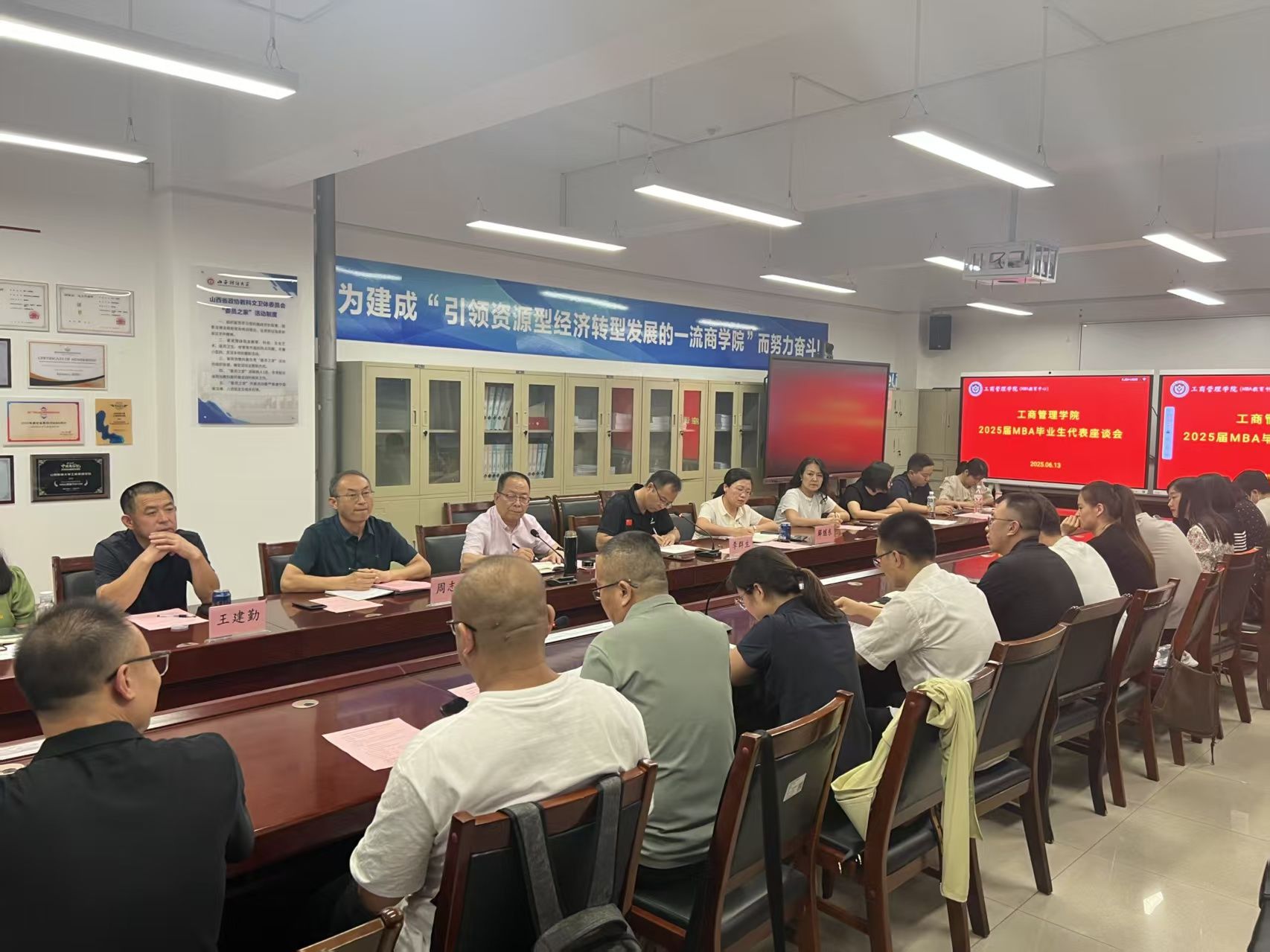 在会议室举行2025届MBA毕业生代表座谈会。学院领导、MBA校友会会长、MBA校友会秘书长、MBA教育中心工作人员、2023级、2024级MBA班主任、2025届MBA毕业生代表、MBA联合会代表等30余人参加会议。会议由学院党委书记李群生主持。