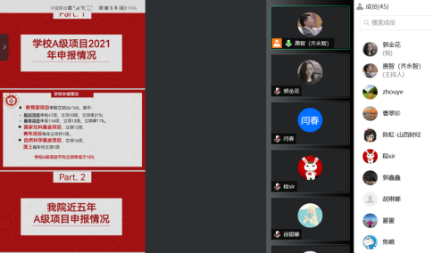 A级项目的申报工作和注意事项做了具体安排。会上明确了三类项目2022年申报教师的具体名单,包括近5年入职无在研项目教师名单和其他有博士学位教师申报建议名单。希望各位教师能够积极申报、认真撰写、反复打磨论证,千锤百炼方能成钢。