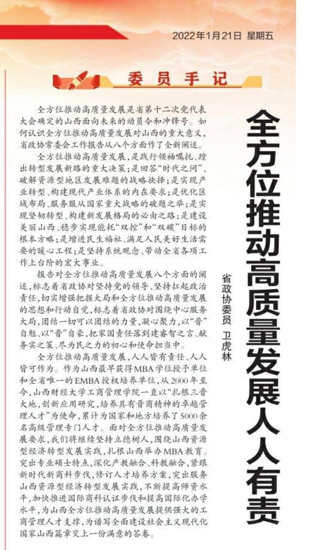院长卫虎林,在山西日报委员手记专栏发表署名文章——《全方位推动高质量发展人人有责》。文中谈到: