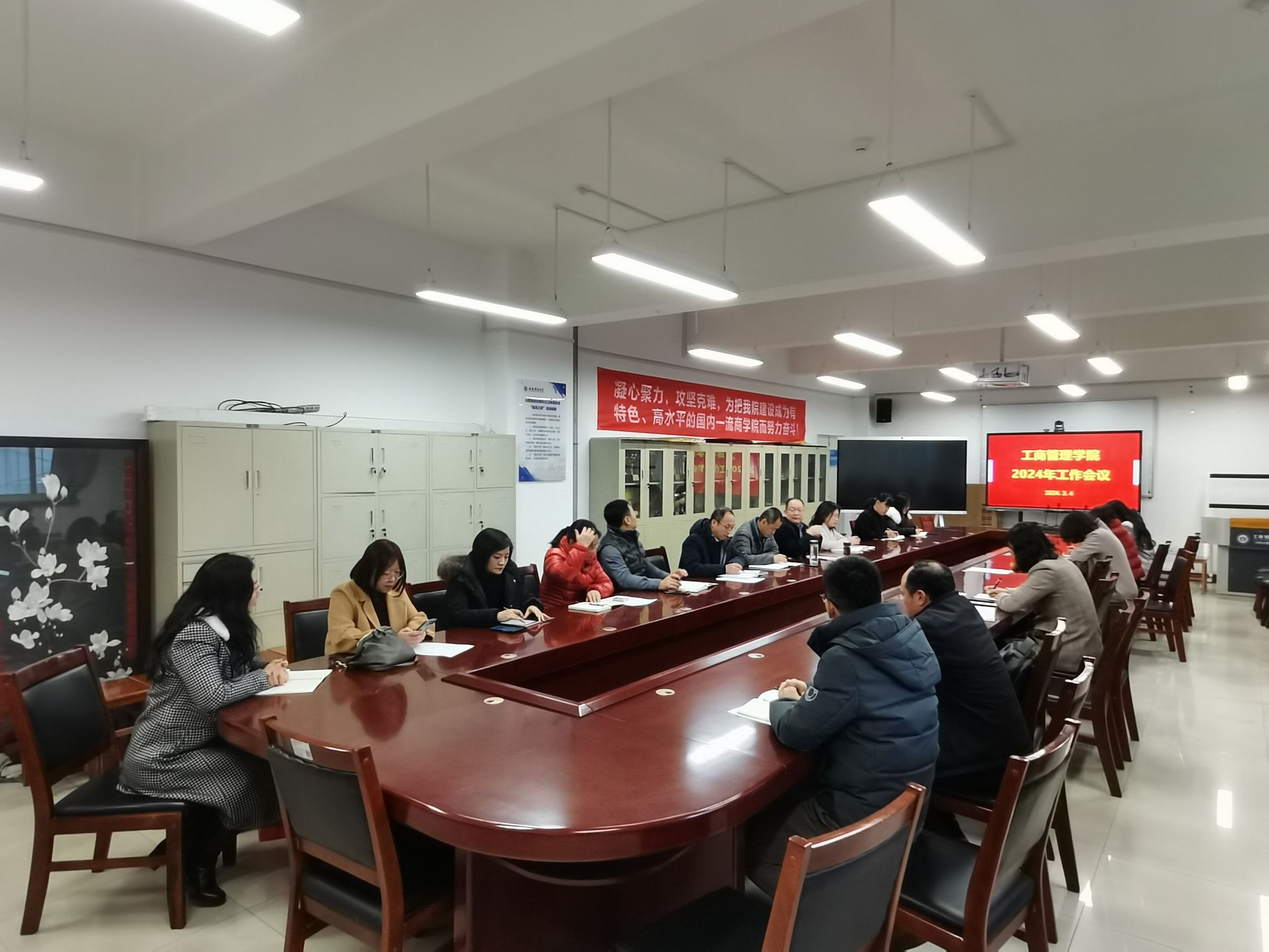 在会议室召开2024年工作会议,传达学校工作会议精神,安排部署学院新一年工作。学院领导班子全体成员、科级干部、院工会主席、各教研室主任、办公室、MBA教育中心全体人员参加会议。会议由卫虎林院长主持。