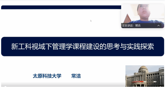 《管理学》课程虚拟教研室组织召开管理学课程建设专题交流会。太原科技大学常洁老师受邀作了题为“新工科视域下管理学课程建设的思考与实践探索”的经验分享。太原科技大学、太原师范学院等虚拟教研室校外成员、学院承担《管理学》课程的教师、管理原理及管理实务教研室有关老师共计20余人参加了本次线上会议。会议由管理学课程虚拟教研室常务负责人马燕翔老师主持。