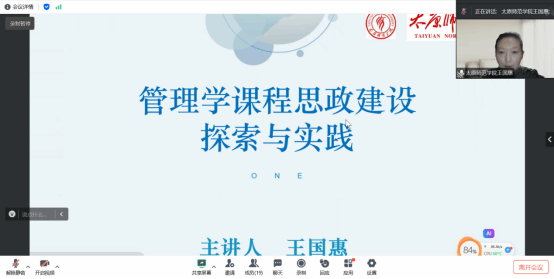 《管理学》课程虚拟教研室组织召开管理学课程思政建设专题研讨会。太原师范学院管理学课程组负责人王国惠副教授受邀作了题为“管理学课程思政建设探索与实践”的内容分享。太原科技大学、太原师范学院等虚拟教研室校外成员、学院承担《管理学》课程的教师、管理原理及管理实务教研室有关老师共计20余人参加了本次会议。会议由管理学课程虚拟教研室常务负责人马燕翔老师主持。