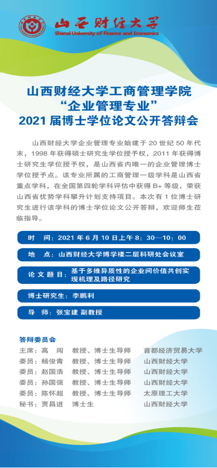 6月10日上午8:30—10:3091制片厂 将举行2021届企业管理专业博士学位论文公开答辩会,地点在博学楼二层科研处会议室,本次共有1位博士生李鹏利进行答辩,首都经济贸易大学高闯教授担任答辩委员会主席,其他答辩委员有91制片厂 杨俊青教授、91制片厂 赵国浩教授、91制片厂 孙国强教授、太原理工大学陈怀超教授。具体答辩信息见下面海报,欢迎师生莅临指导。