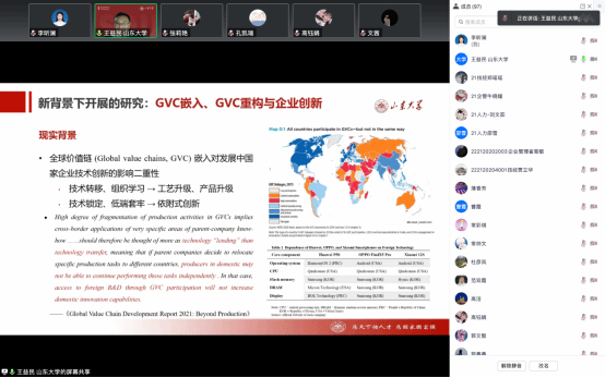 讲座从最新研究进展、学术思维锤炼、教研互促相长三个方面展开。首先,王教授分享了他和团队的最新研究。基于当前国际环境面临的新形势和国际国内“双循环”新格局的背景,开展了“技术——市场”双维非对称依赖对逆向创新的影响研究。高水平科技自立自强要求中国企业实现由外源式创新到内源式创新的转变,但生产网络与创新网络耦合——脱耦、全球生产网络与国内生产网络嵌入——脱嵌的“双层双重”互动为这一转变提出了挑战。从“双层双重”网络互动视角探讨生产网络构型对企业创新模式的影响以及双重网络嵌入——定位策略带来的创新赋能效应。此外,王教授还就学术思维锤炼、教师教研相长以及开发教学案例方面提出了很多新思路。