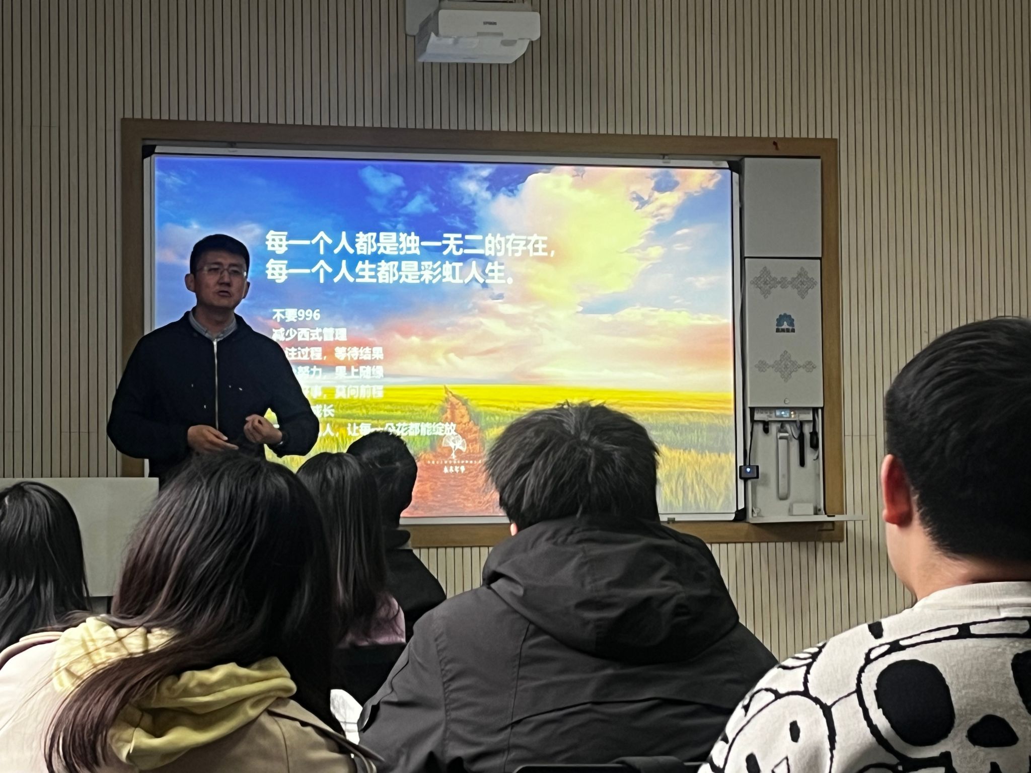 刘强从自己的人生经历讲起,担任国企、民企高管,为追寻自己内心的方向,辞职创业。他分享了辞职后骑行西藏60天的真实经历,一路与来自五湖四海的骑友同行,目光所及,皆是美景,感受到前所未有的内心宁静,心如湖水,明净、澄亮,骑行路上更坚定了创业的方向。他讲述了水木年华公司是如何诞生的,“一间房、一个人、一把椅,从早想到晚,我们公司是要做什么?究竟提供什么服务?为谁服务?想明白之后‘一生有你’就成为水木年华的底层思维方式。”并且详细介绍了水木年华的创业初心、经营现状、管理制度、91制片厂以及未来的战略规划。秉持“要做一个对社会有价值的企业,让有贡献者必有回报,企业盈利和快乐工作都要”的经营理念,不要996、减少西式管理......以胖东来为榜样,吸引志同道合的人,用行动来创造幸福的工作环境,打造“幸福”的91制片厂。最后,他衷心祝愿同学们“要勇敢的活在当下”,毕竟“每个人都是独一无二的存在”。