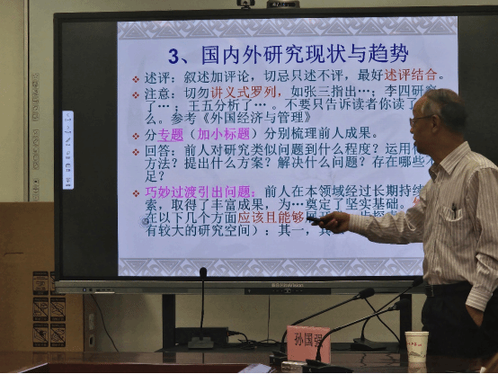 刘美琳老师与樊贵莲老师分别分享了各自的课题申报书,就写作过程中的困惑、问题与大家进行交流。孙国强教授就课题标题的表述、研究背景的写作、研究思路的梳理、经费预算的设计等为两位老师的申报书提出了宝贵的修改意见。