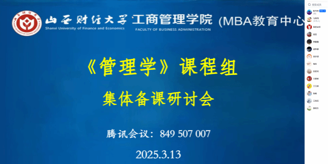 程艳、梁彦清、王玉娟、胡琳娜、王慧敏等五位老师,分别从课程的整体构思、理论框架、重点难点等几个方面进行说课。特别是对学情分析、案例教学方法与技巧、如何有效开展课堂小组讨论等,分享了各自的经验与做法。参会教师围绕教学大纲、教学资源、学情分析、教学方法、课程思政、考核方案、教改计等进行了深入讨论交流。学院教指委梅莉老师从规范教学、统一标准、共享资源、交流方法、探索问题、应对未来等角度指出了集体备课的目的与意义,并对人工智能背景下《管理学》课程面临的挑战与发展进行了分析。