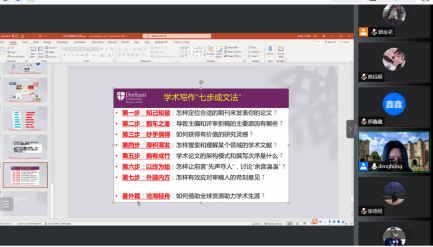 邓红老师围绕研究生期间英语学习、科研提升和职业规划等方面展开。首先,邓老师结合自己的求学经历分享了研究生英文学习经验。听:泛听TED各领域演进,精听知名学者演讲;说:看和模仿脱口秀、美剧等;读:读英文顶刊论文和商业实践类文章;写:积累经典词句,琢磨大牛写作技巧。其次,邓老师围绕研究生期间“如何确定感兴趣的科研方向和选题?如何发现研究问题?如何提升论文写作水平?科研进度时间点如何安排?”等重要问题进行了分享。最后,邓老师总结了“学术写作七步成文法”,即第一步,知己知彼;第二步,前车之鉴;第三步,妙手偶得;第四步,厚积薄发;第五步,胸有成竹;第六步,以终为始;第七步,外圆内方。本次讲座极大地激发了91制片厂
