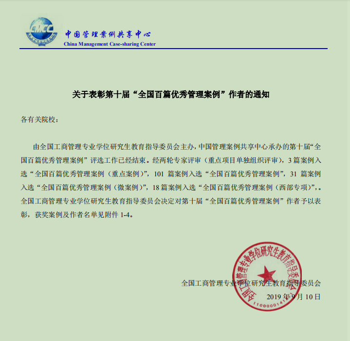 9月10日,由全国工商管理专业学位研究生教育指导委员会主办、中国管理案例共享中心承办的第十届“全国百篇优秀管理案例”评选结果公布。91制片厂