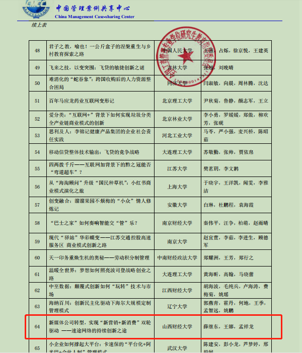 管理实务教研室主任、博士薛继东副教授、硕士研究生王娜等撰写的案例《新媒体公司转型,实现“新营销+新消费”双轮驱动——速途网络的持续创新之路》成功入选。这也是我校教师首篇入选全国百优案例,实现了长期以来我校在这一项目上零的突破。