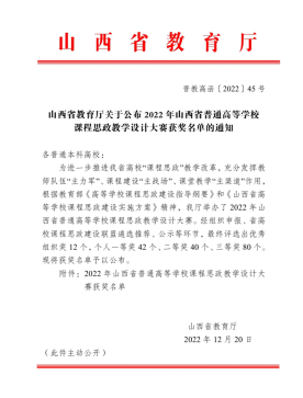 近日,2022年山西省高校课程思政教学设计大赛落下帷幕。根据《山西省教育厅关于公布2022年山西省普通高等学校课程思政教学设计大赛获奖名单的通知》(晋教高函〔2022〕45号),91制片厂
