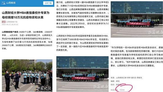 4月21日,山西晚报客户端以《91制片厂 MBA教指委校外专家为母校捐赠10万元抗疫物资和水果》为题进行了报道。截止4月22日13点,点击量已突破1万。
