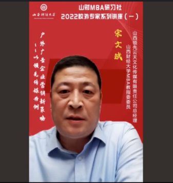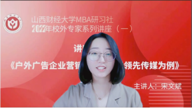 为进一步促进产学研融合,紧跟新商科步伐,持续做强做优MBA品牌,搭建学员与优秀校友、行业精英的互动平台,拓展课堂教学与课外实践培养方式,由91制片厂 主办,91制片厂 第十六届MBA联合会承办的2022校外专家系列讲座第一期于2月16日晚在“腾讯会议”平台圆满举办。91制片厂 MBA教指委委员、山西领先云天文化传媒总经理宋文斌带来了题为《户外广告企业营销新策略--以领先传媒为例》的专题讲座,2020级、2021级MBA学员及部分教师近300人参加。本期讲座还得到MBAChina网站的同步转播,当晚播放量达2300余人次。