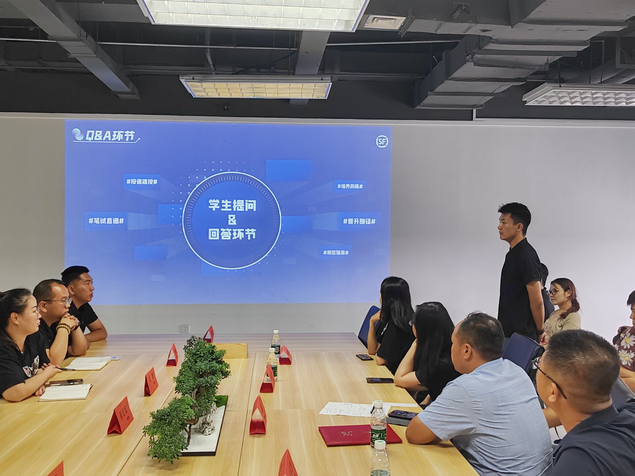 在提问与交流环节,山西顺丰参会者对学生们提出的问题进行了详细解答。刘江鹏主任代表学院向山西区人力资源部负责人靳宏斌经理颁发了本科生校外实践导师聘书。