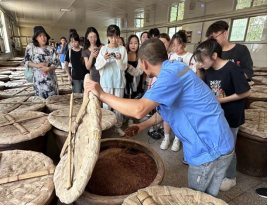 宁化府益源庆力诚醋业有限公司负责人、宁化府非遗传承人李俊文带领参访师生参观酿醋生产车间,详细介绍了以“蒸酵熏淋陈”为核心的益源庆固态发酵酿制技艺。宁化府陈醋酿造始于优选原料,所用的红心大曲由内蒙古草原的有机豌豆和大麦制成,红心大曲集中了普通大曲和红曲的优点,其主要生香菌种红曲霉具有较强的糖化酶活力,能代谢产生红曲色素及多种醛、酮等风味前体物质。李俊文介绍道,“宁化府老陈醋一直保持甜、绵、酸、香、久存不腐的特点,从原料配比、发酵控制、淋醋、陈酿都有严格的操作规程,注重色香味体态。”